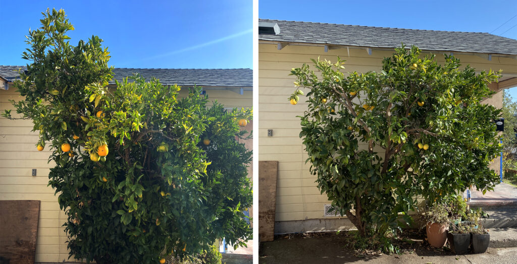 The nature of a citrus is to grow compact, and this ends up with a clustered plant, with light only reaching the leaves on the outside. Since the dark inside of a clustered citrus tree invites mold, pests, and decay, my main goal when I prune any citrus tree is to thin the tree out and create a flowing apparent structure with lots of light. This tree was left with a more balanced energy, ensuring a healthier direction until next time.